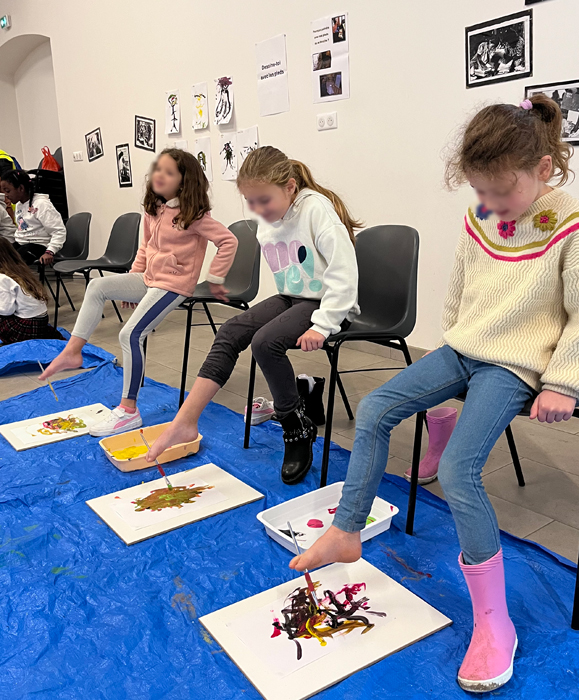 - Expression artistique : un atelier de peinture avec le pied pour dessiner un bonhomme.